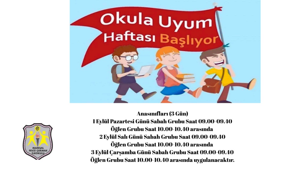 2025-2026 Eğitim Öğretim Yılı, 1 Eylül Pazartesi Günü Anasınıfı ve İlkokul 1.Sınıf Öğrencilerinin Katılım Sağlayacağı Uyum Programı ile Başlayacaktır. 1-3 Eylül Tarihleri Arasında Gerçekleştirilecek Uyum Programına Ait Detaylı Bilgiye Aşağıdaki Görsellerden Ulaşabilirsiniz. 8 Eylül 2025 Pazartesi Günü İse Eğitim Öğretim Tüm Kademelerde Başlayacaktır.